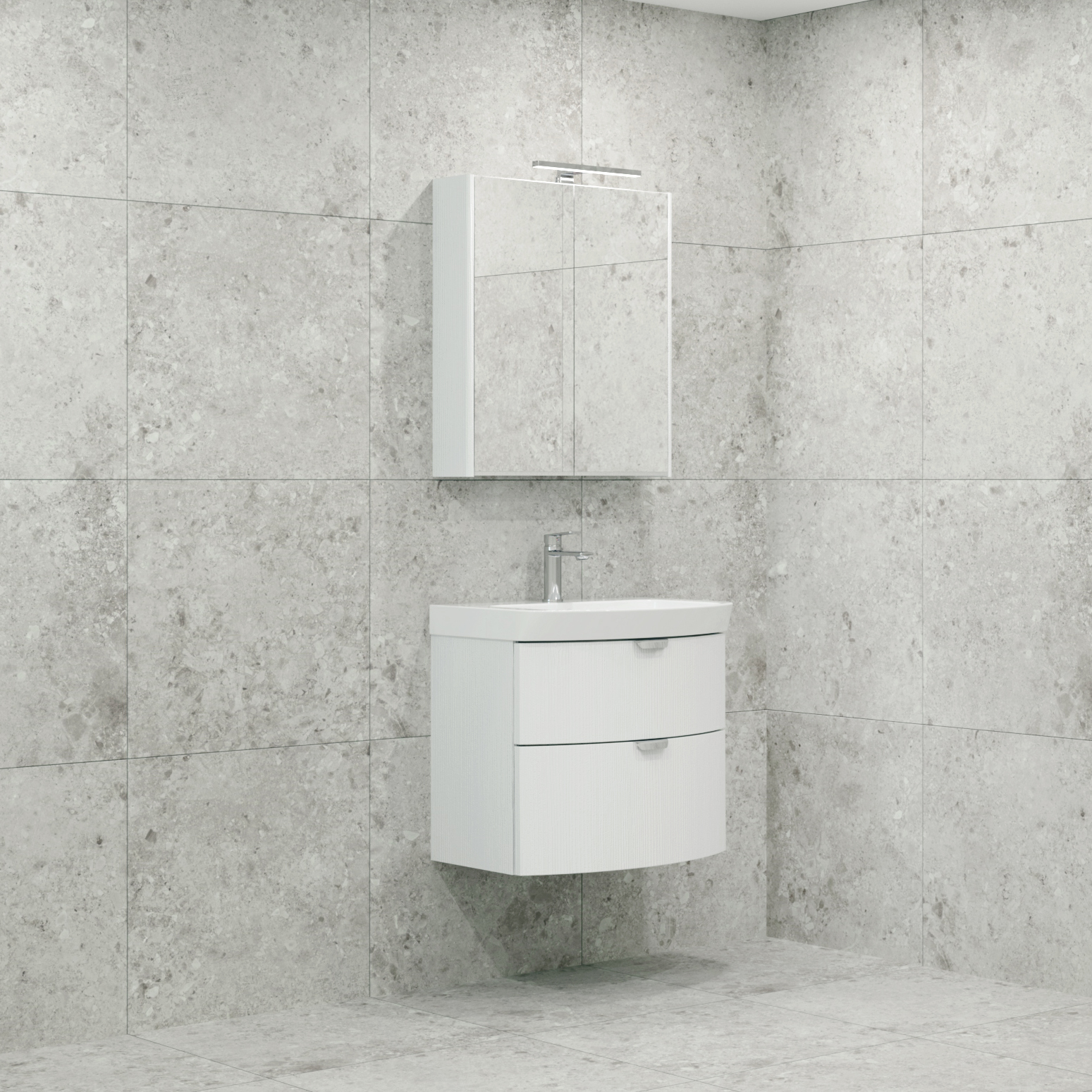 Ett stilrent spegelskåp med rundad design och energieffektiv T-belysning. Spegelskåpet har flyttbara hyllplan, invändigt eluttag samt spegeldörrar med dubbelsidig spegelyta. Rundade träprofiler i vit eller svart ekfanér ger ett enhetligt uttryck tillsammans med kommoden. Spegeldörrarna har i nedre kant mellan glasen en frostad sektion vilket helt motverkar fingeravtryck på såväl in- som utsidan. Skåpet levereras färdigmonterat och är IP44-klassat för badrumsmiljö.