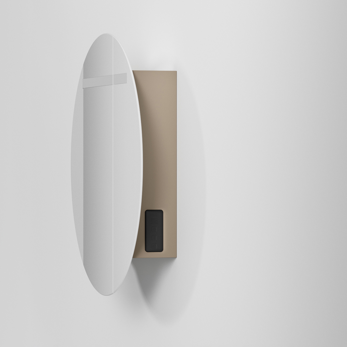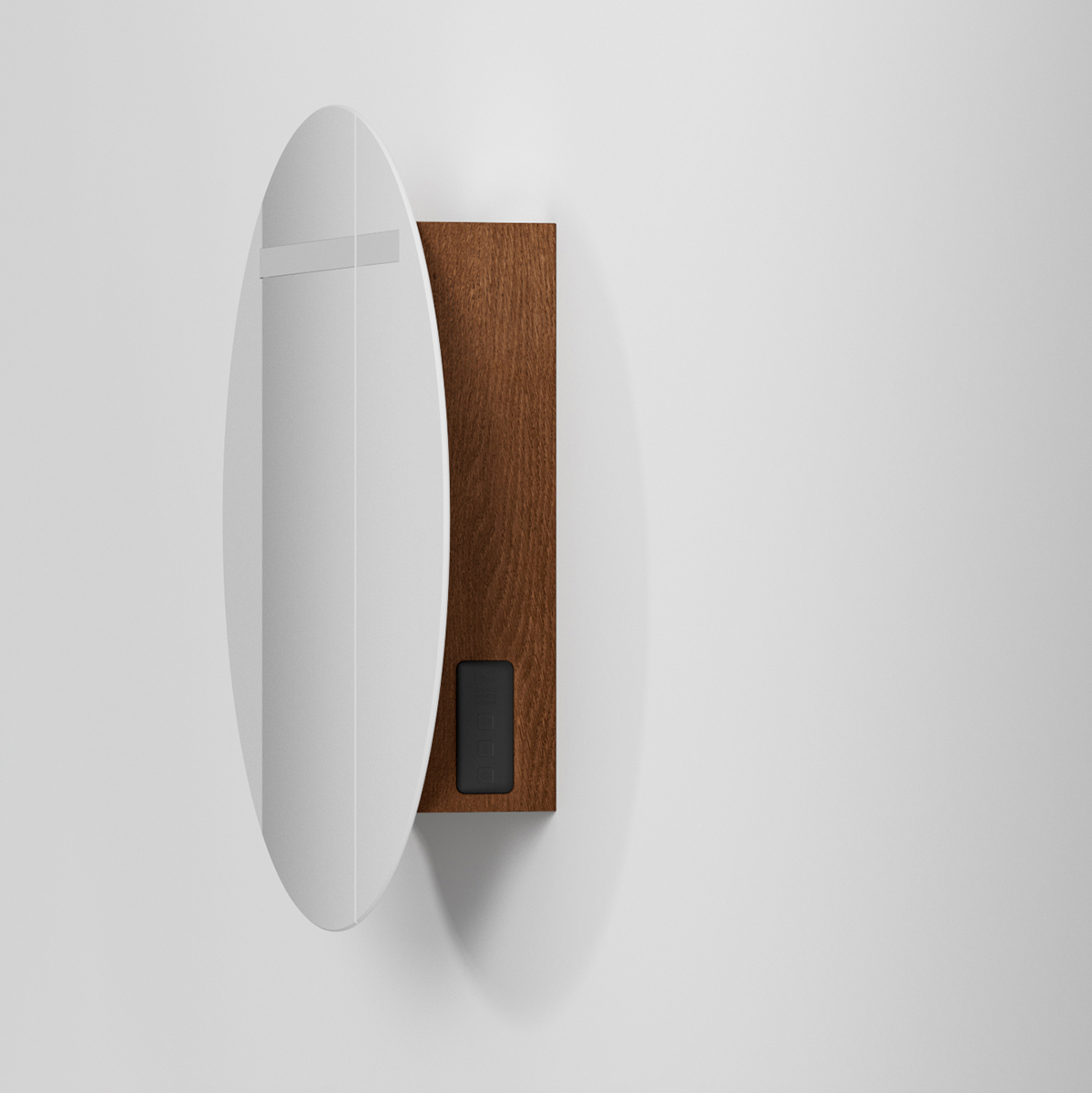 Spegelskåp INR Circ är INRs mest exklusiva och påkostade spegelskåp, topputrustat med rund spegel och många valmöjligheter. Belysning över, under samt inuti som regleras med hjälp av en touchpanel på sidan. Spegelskåpet finns i samma fanér som möbelserie Air samt i vitt och Accent/NCS. Rygg och hyllplan inuti skåpet kommer alltid i Natural Oak. Circ har invändig belysning samt en touchpanel på höger utsida på vilken du reglerar ljusstyrka och färgtemperatur. Släck ner och återkom till samma inställning nästa gång du tänder belysningen. Eluttag och prylhållarmagnet ingår. Med tillvalet Plus Zoom får du sminkspegel som du fäster på valfri plats.