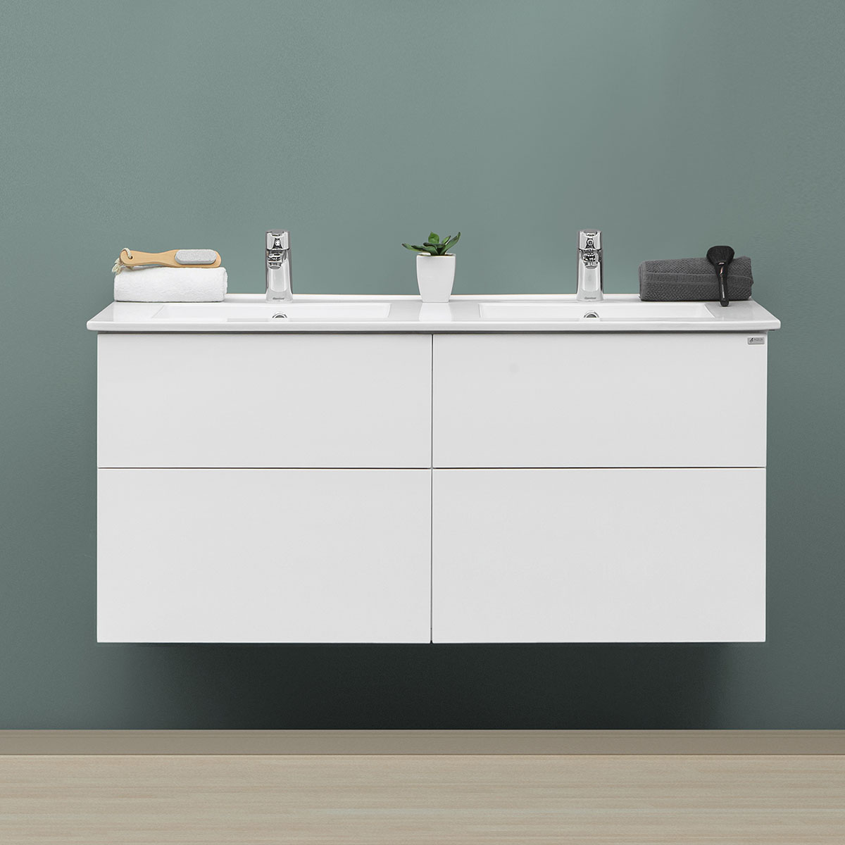 4AQUA Tvättställsskåp Slim H är ett tvättställsskåp i stilren och minimalistisk design som passar in i de flesta hem. Möbeln kommer med mjukstängande lådor med fullutdrag, lådsidor av metall en sminkhållare, lådmatta och en löstagbar lådindelning. Möbeln är förberedd för både golv- och väggavlopp och har justerbara upphängningsbeslag för enkel montering av en person.