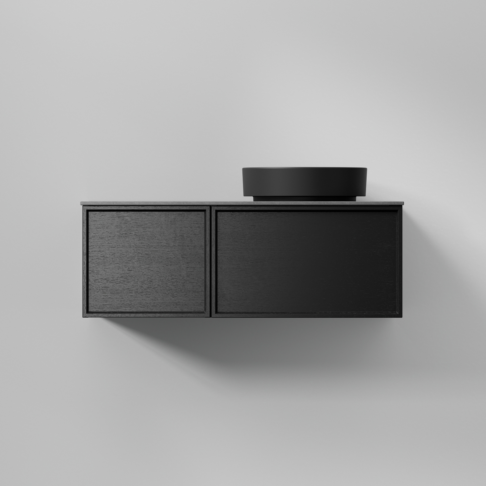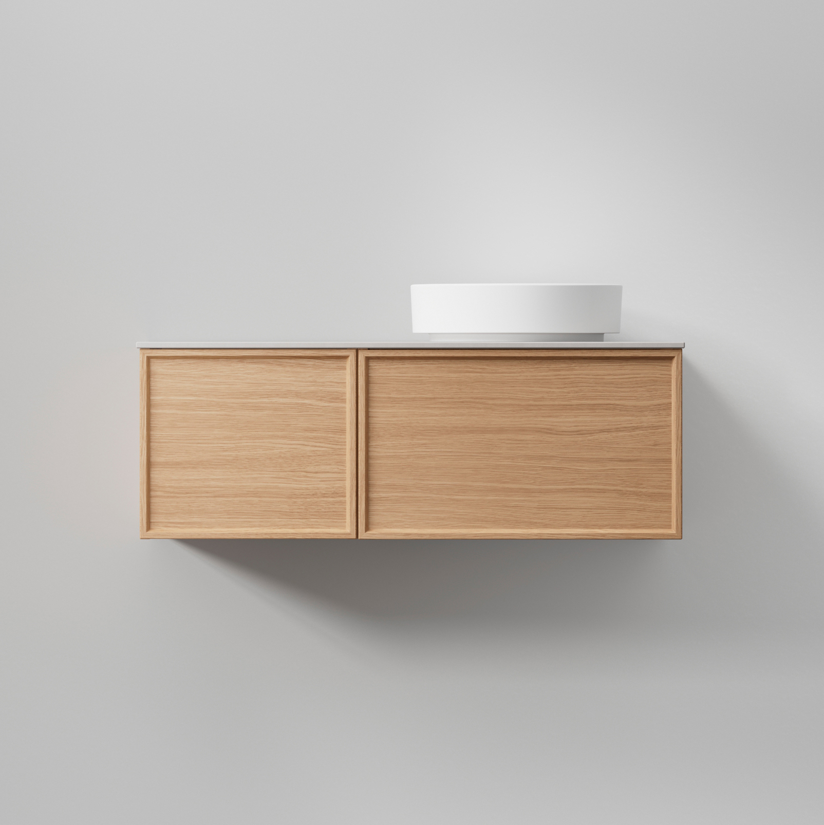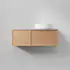 Tvättställskåp INR Air Wood 100 är ett modernt tvättställsskåp med hel lådfront med fackindelad innerlåda och förvaring med lucka. Detaljer i massiv ek.