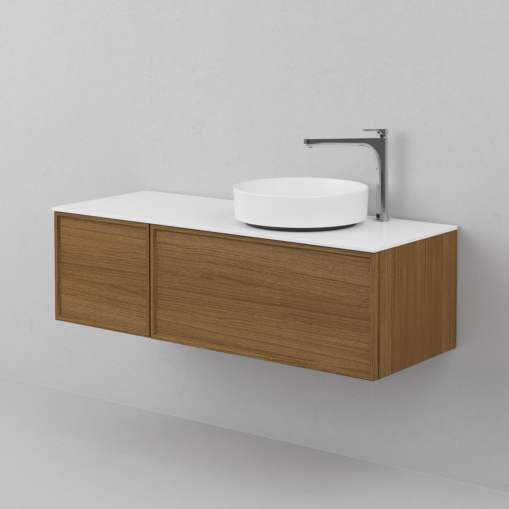 Tvättställskåp INR Air Wood 1200 är ett modernt tvättställsskåp med hel lådfront med fackindelad innerlåda och förvaring med lucka. Detaljer i massiv ek.