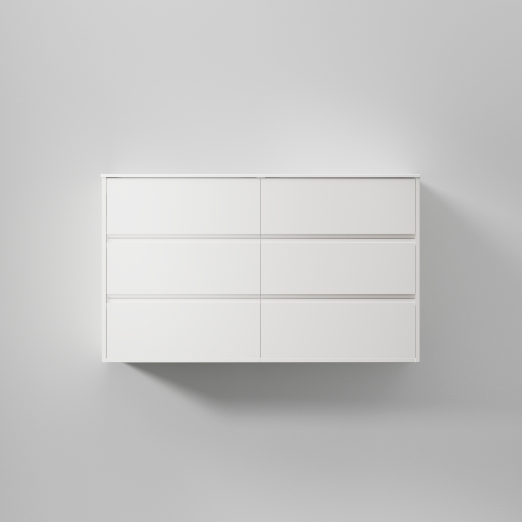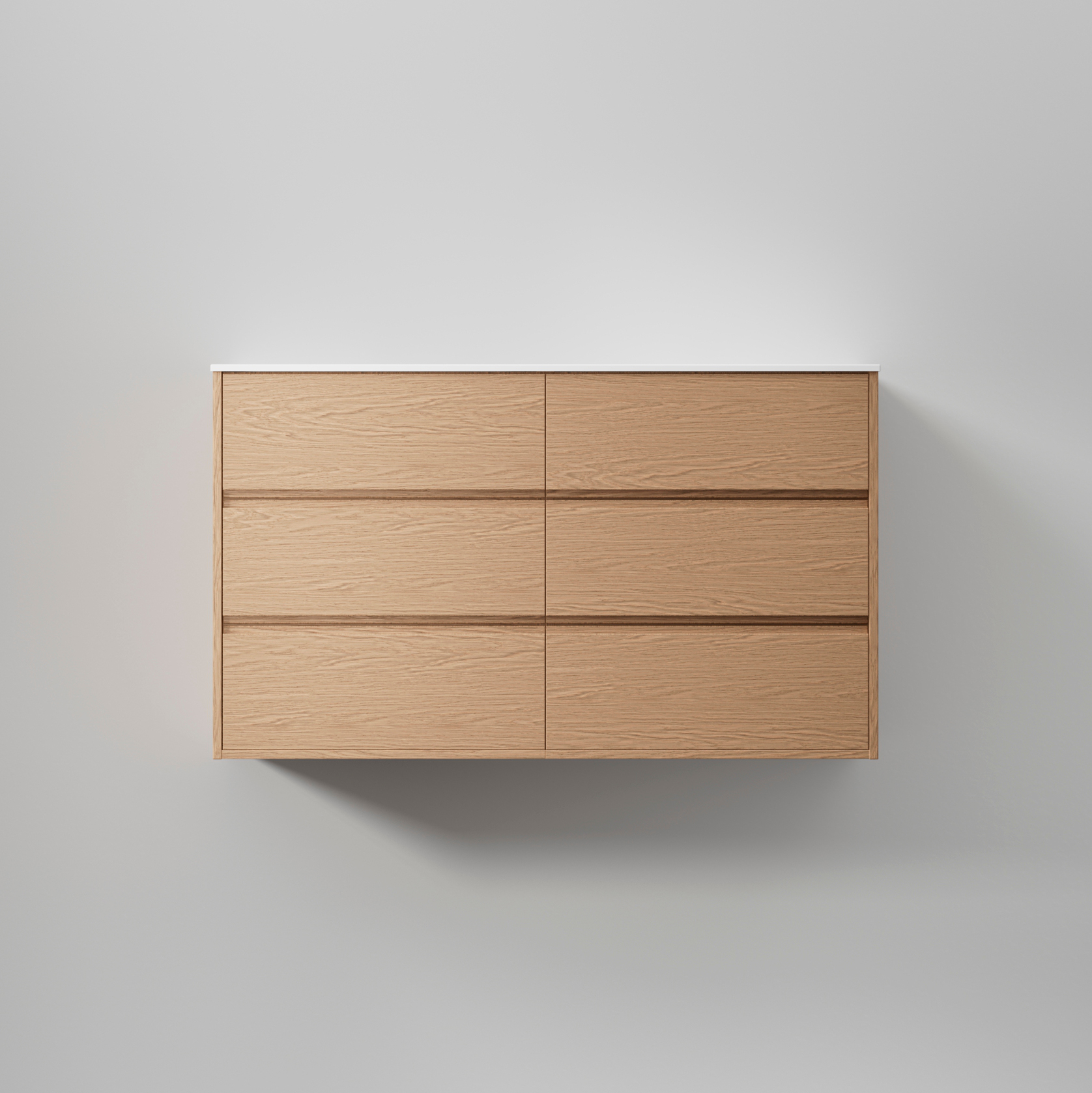 Tvättställsskåp INR Terra Grip med dubbla tvättställ är möbeln som rymmer hela familjens badrumsrutiner, och lite till. Här får du mer av allt – förvaring, funktion och estetik – samlat i en möbel som fungerar lika bra i vardagen som den gör för ögat. De sex fullt utdragbara lådorna erbjuder generöst med plats för var sak, på sin plats, och den infällda grepplisten längs hela fronten ger en tydlig linje i uttrycket, diskret, men distinkt. Ett större mönster i fanéren än i övriga INRs serier ger en varm och levande känsla. Välj mellan Natural Oak och Dark Oak, eller gå för en helvit helhet i Pure White. För en mer personlig stil finns valfri kulör från hela NCS-skalan.