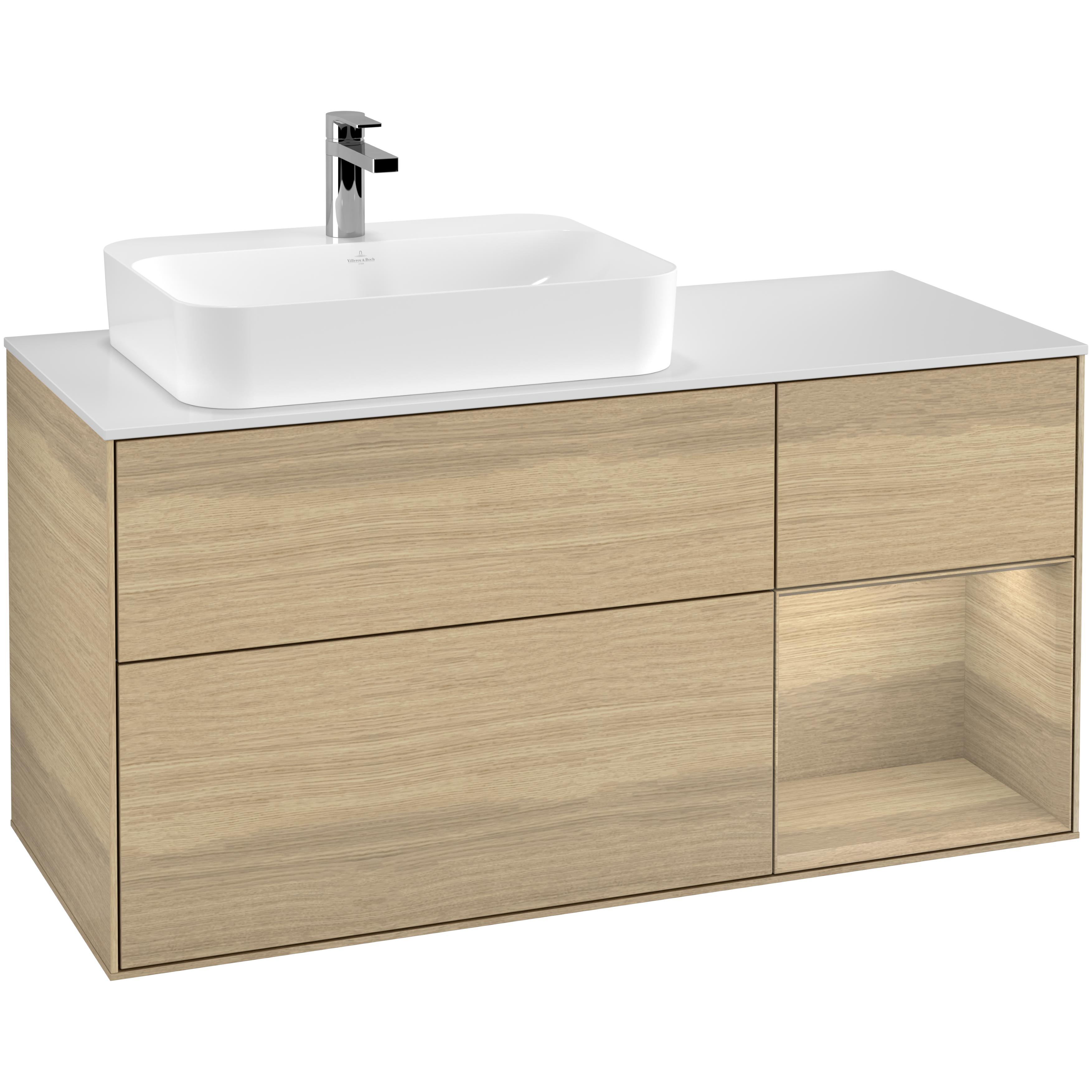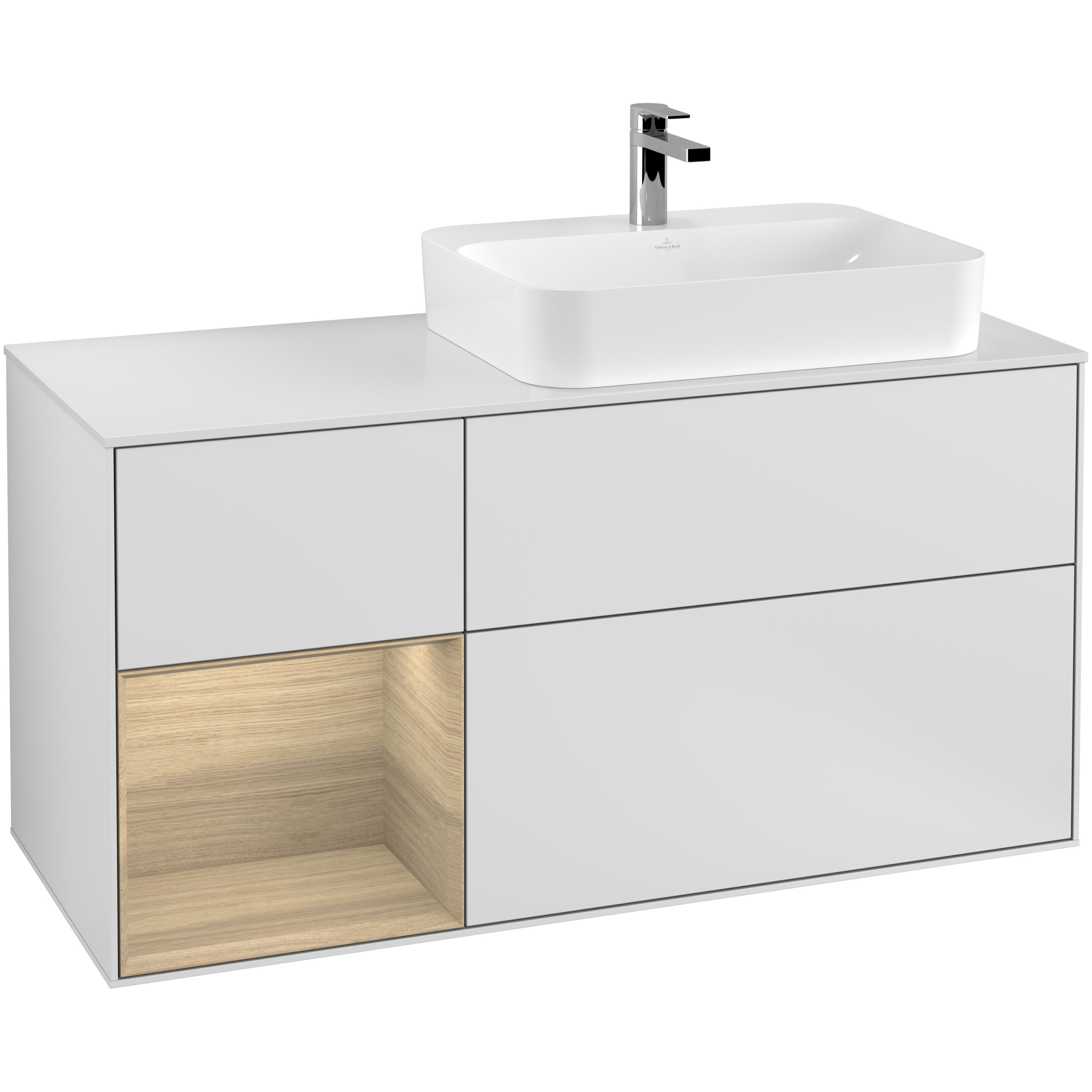 Tvättställsskåp Villeroy & Boch Finion med 3 Lådor Hylla och Bänkskiva för Ocentrerat Ytmonterat Tvättställ är det perfekta tvättställsskåpet för ditt badrum. Kommoden är en del av Villeroy & Boch populära serie Finion och består av 2880 varianter anpassade för ovanpåliggande tvättställ.