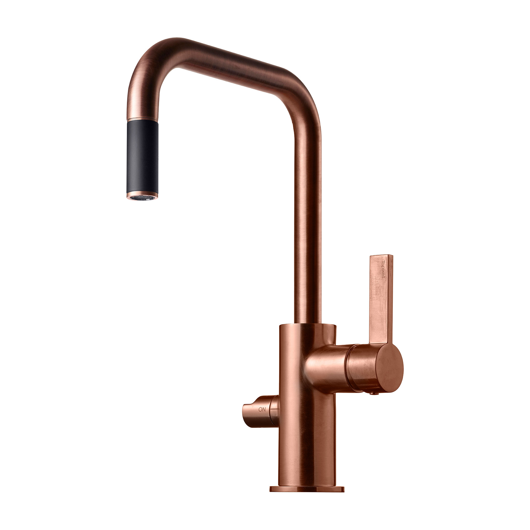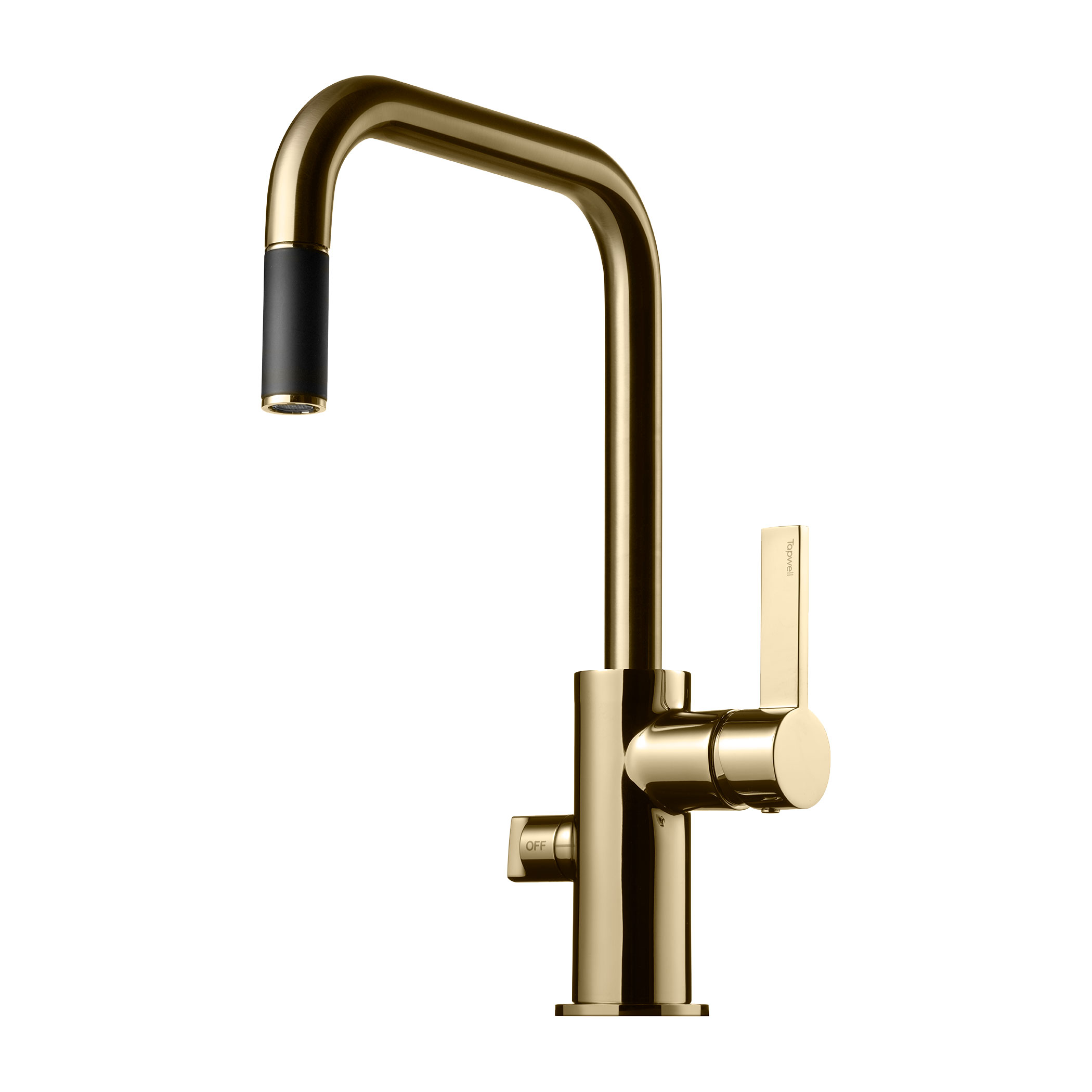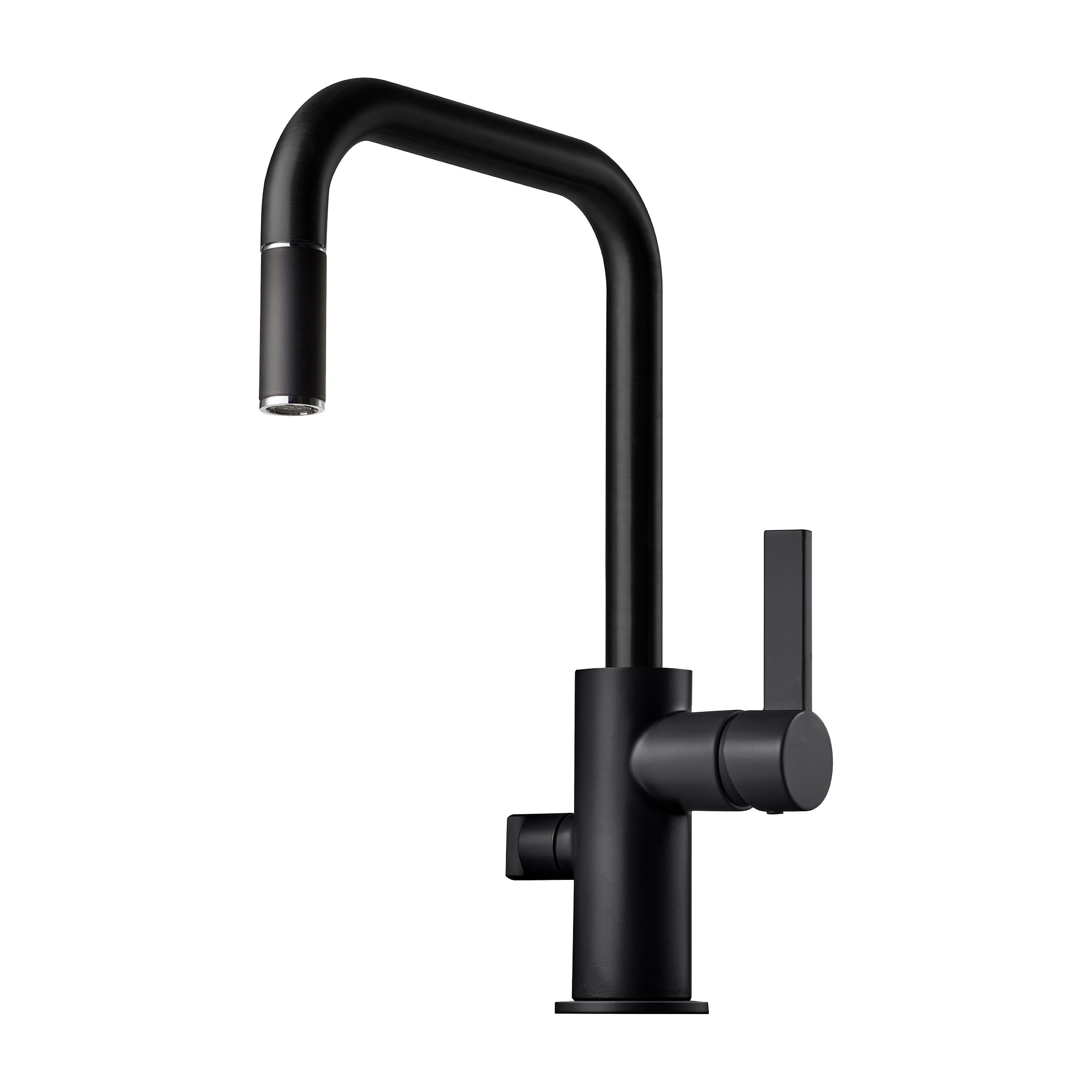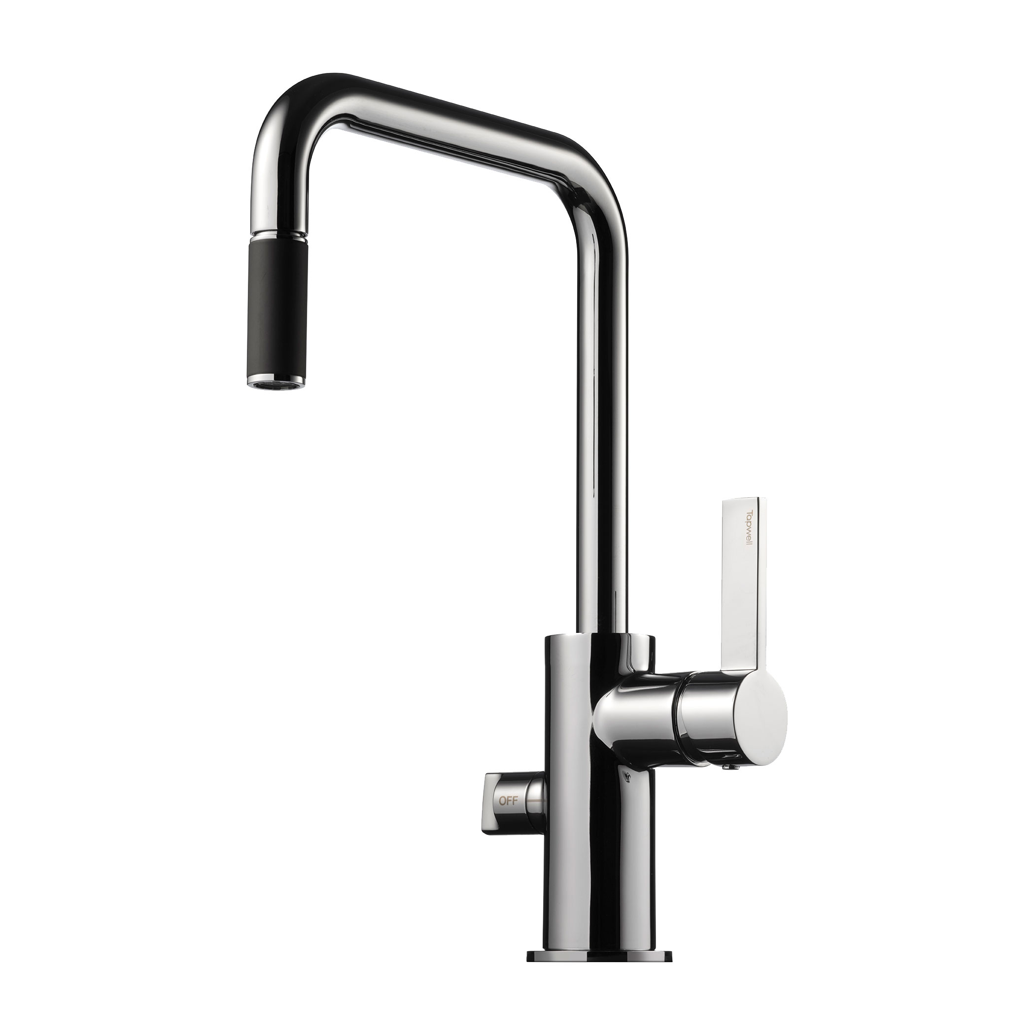 Köksblandare Tapwell ARM587 med svängbar pip, diskmaskinsavstängning och utdragbart munstycke. OBS - håltagning Ø40 mm. Pipens svängradie går att begränsa till mellan 60 och 270 grader med 15 graders intervaller.