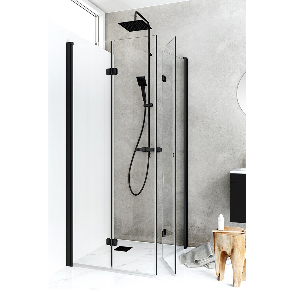 Snabbmonterad hörndusch från Hafa med integrerade handtag som viks på mitten för att ta minimalt med plats. Limbara profiler och enkel att installera och justera tack vare tekniken InstaQuick. Kan monteras med 12 mm utanpåliggande rör, cc35 mm. 6 mm härdat säkerhetsglas, höjd 2000 mm. 18 mm släplist ingår. Dörrarna är vändbara.