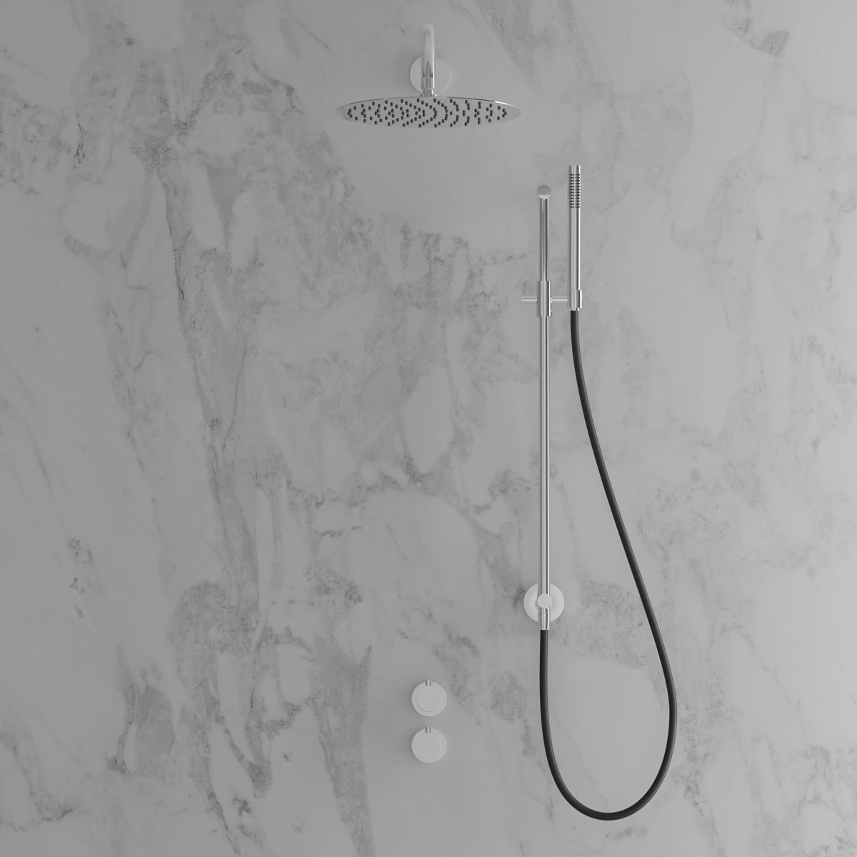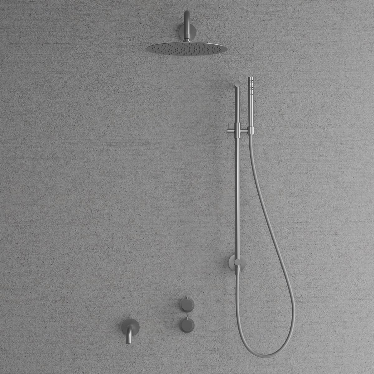 Dold montering bakom vägg ger badrummet ett minimalistiskt och harmoniskt intryck. Inkluderar en tunn väggmonterad taksil med generös omkrets, en duschstång med reglerbart handduschfäste samt en cylindrisk handdusch som avger ett mjukt behagligt vattenflöde med bred spridning. Tidlös design som samspelar med ett skandinaviskt formspråk.