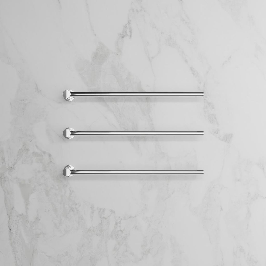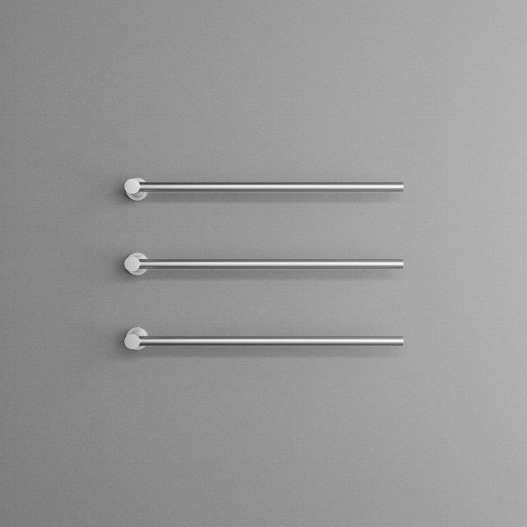I horisontell modell med justerbara stänger som kan installeras i båda riktningarna för maximal funktionalitet. Idealisk för att hålla handdukar både torra och behagligt varma.