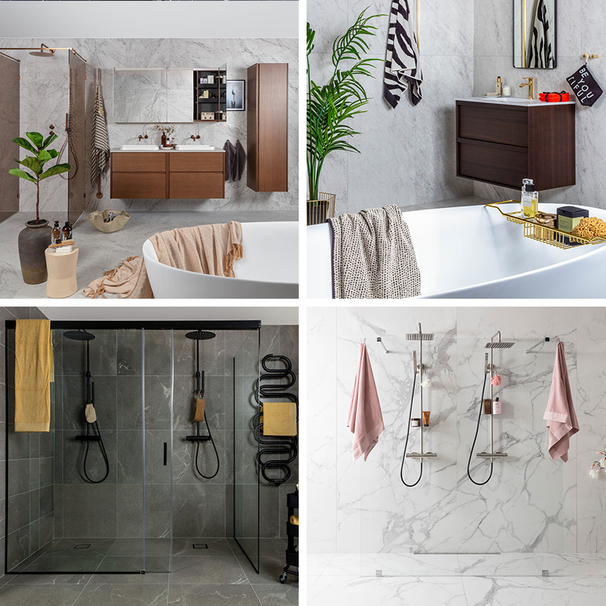 Wellness koncept är viktigt och syns tydlig i val av material och olika lösningar som öppna, stora duschutrymmen eller sköna, fristående badkar. Material som trä, blanka eller matta detaljer och färgat glas skapar en tidlös och lyxig spa-känsla.