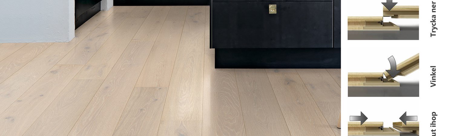 Detta är den bästa metoden för att snabbt lägga golvet på stora ytor. För in plankans långsida mot den tidigare lagda plankan och tryck till.
