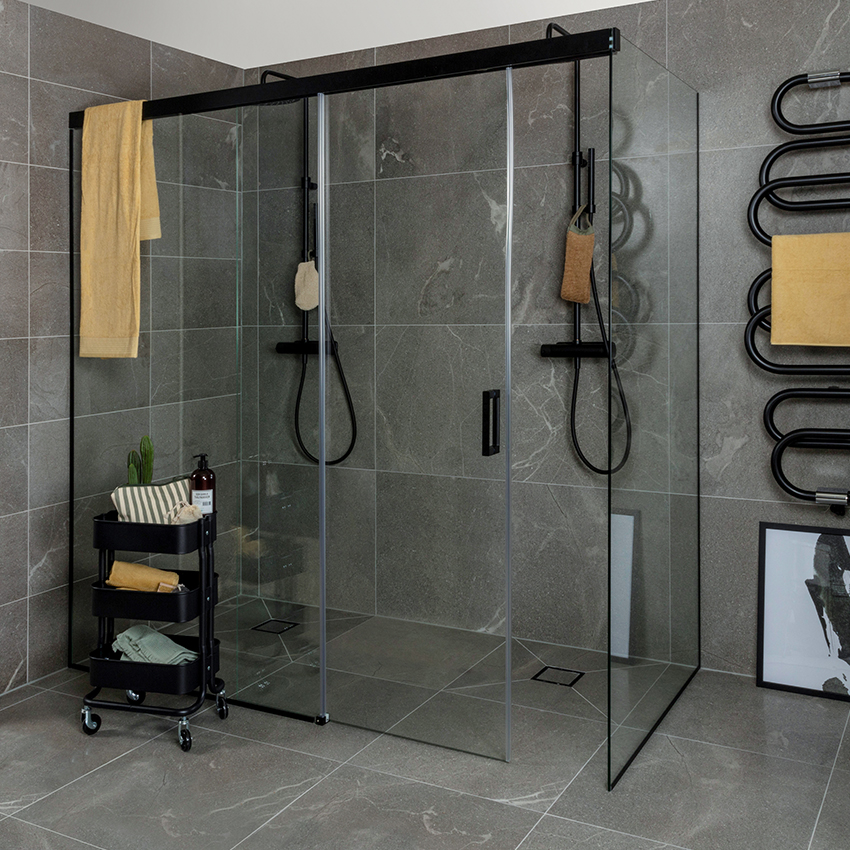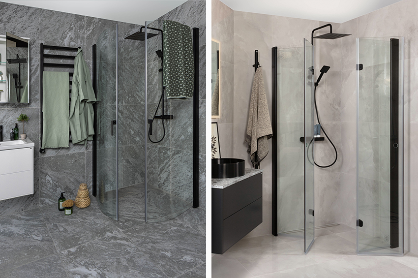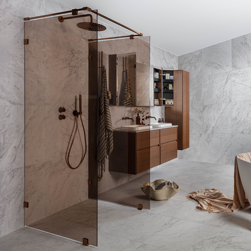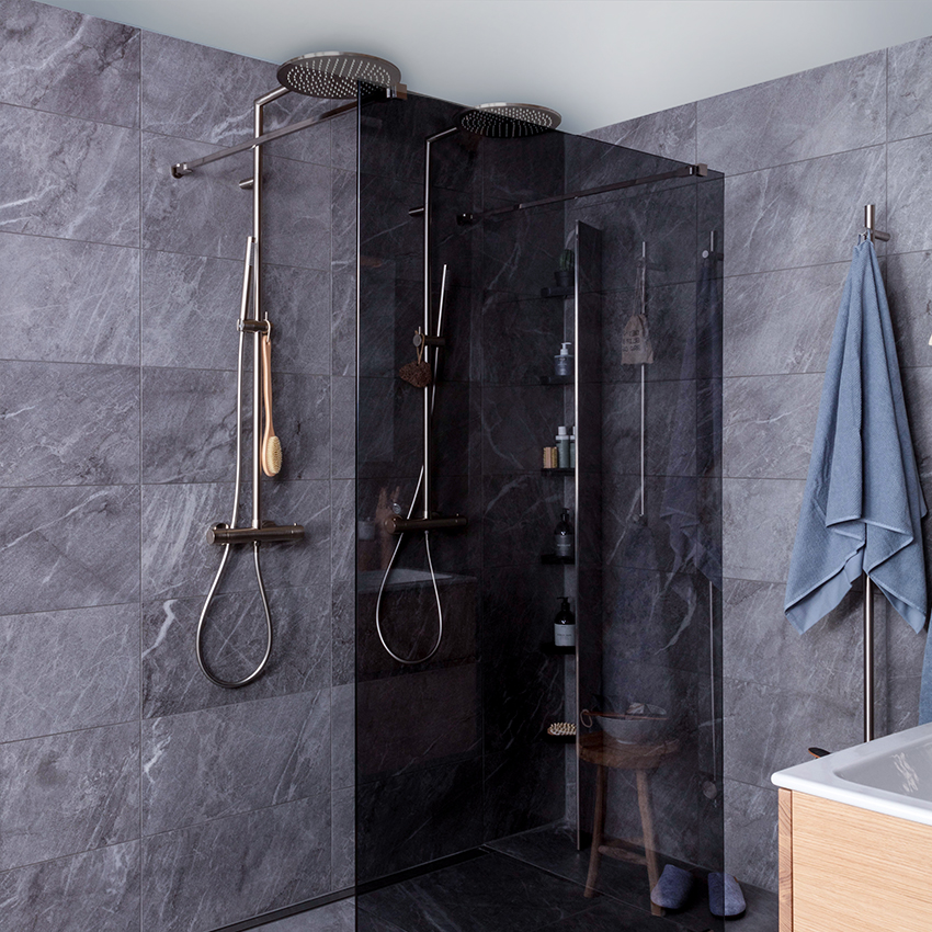 I stora badrum har man fler möjligheter till en djärvare design och kan skapa spännande lösningar som känns lyxiga och tidlösa. Här kan du verkligen gå utanför boxen och skapa exempelvis walk-through dusch, singeldusch med två väggar eller dubbeldusch med skjutdörr. Färgen på glas och profiler kompletterar slutresultatet och ger ditt badrum den där speciella finishen.